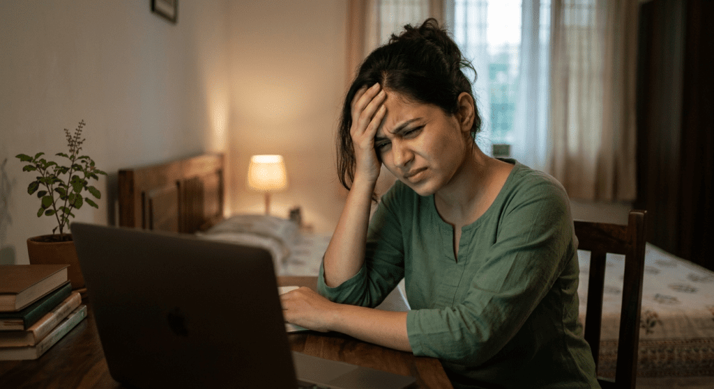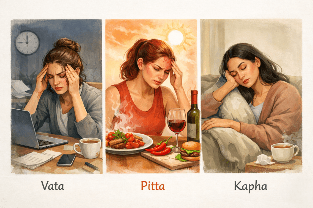 Your triggers often give clues. When migraine follows anxiety, poor sleep, or an irregular schedule, it is often linked to Vata. Migraine triggered by spicy food, excess heat, or acidity usually indicates a Pitta imbalance. A feeling of heaviness or migraines after overeating may suggest the involvement of Kapha.
